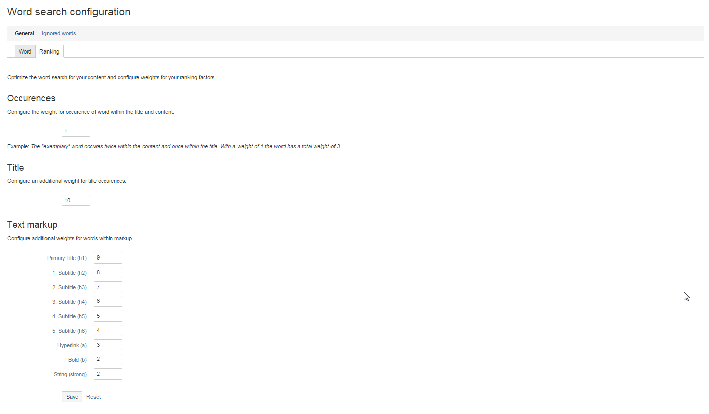 Here you can configure the weight (importance) of found words within a specific context of the content, for instance the title or hyperlinks.