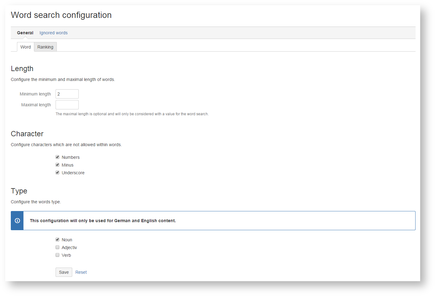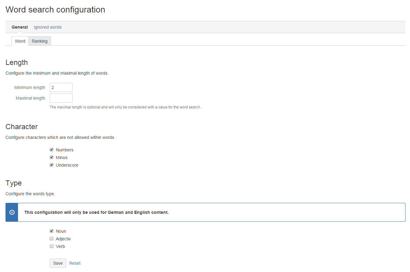 Here you can define, which words should be considerd, how long a word can be and so on.