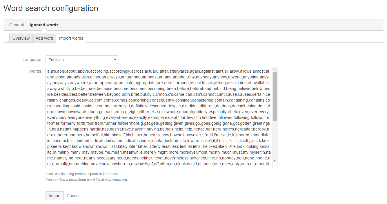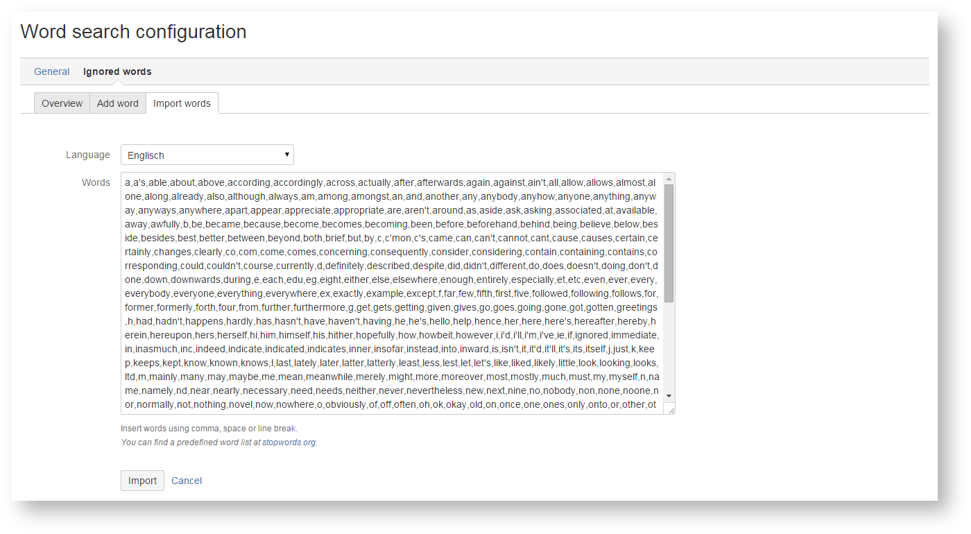 Use this dialog to import or add new ignored words manually. You can download word lists in different languages from stopwords.org.