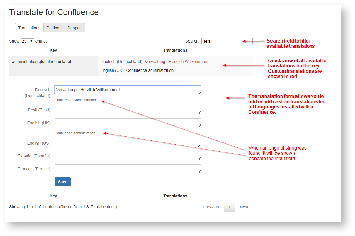 3. (It is recommended enable the checkbox for “Show in menu”. If enabled the users will see a link within Confluence cog menu to the translations list.)