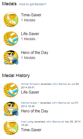 MedalsIn this area you can see, which Medal the Karma User was awarded yet and how often. The top right link will give you an overview on all available badges. Futhermore, there is a "Medal History" that shows the last 20 awarded medals for that user. |